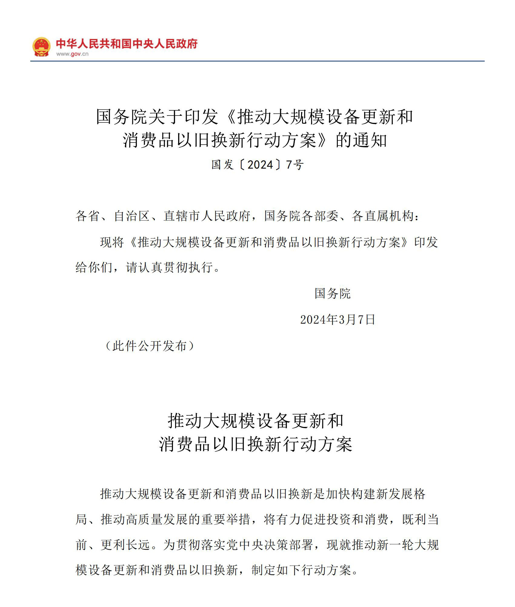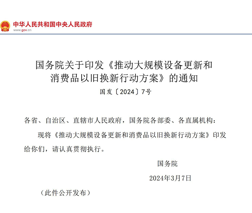 3月13日晚間,國務(wù)院正式印發(fā)《推動大規(guī)模設(shè)備更新和消費(fèi)品以舊換新行動方案》。