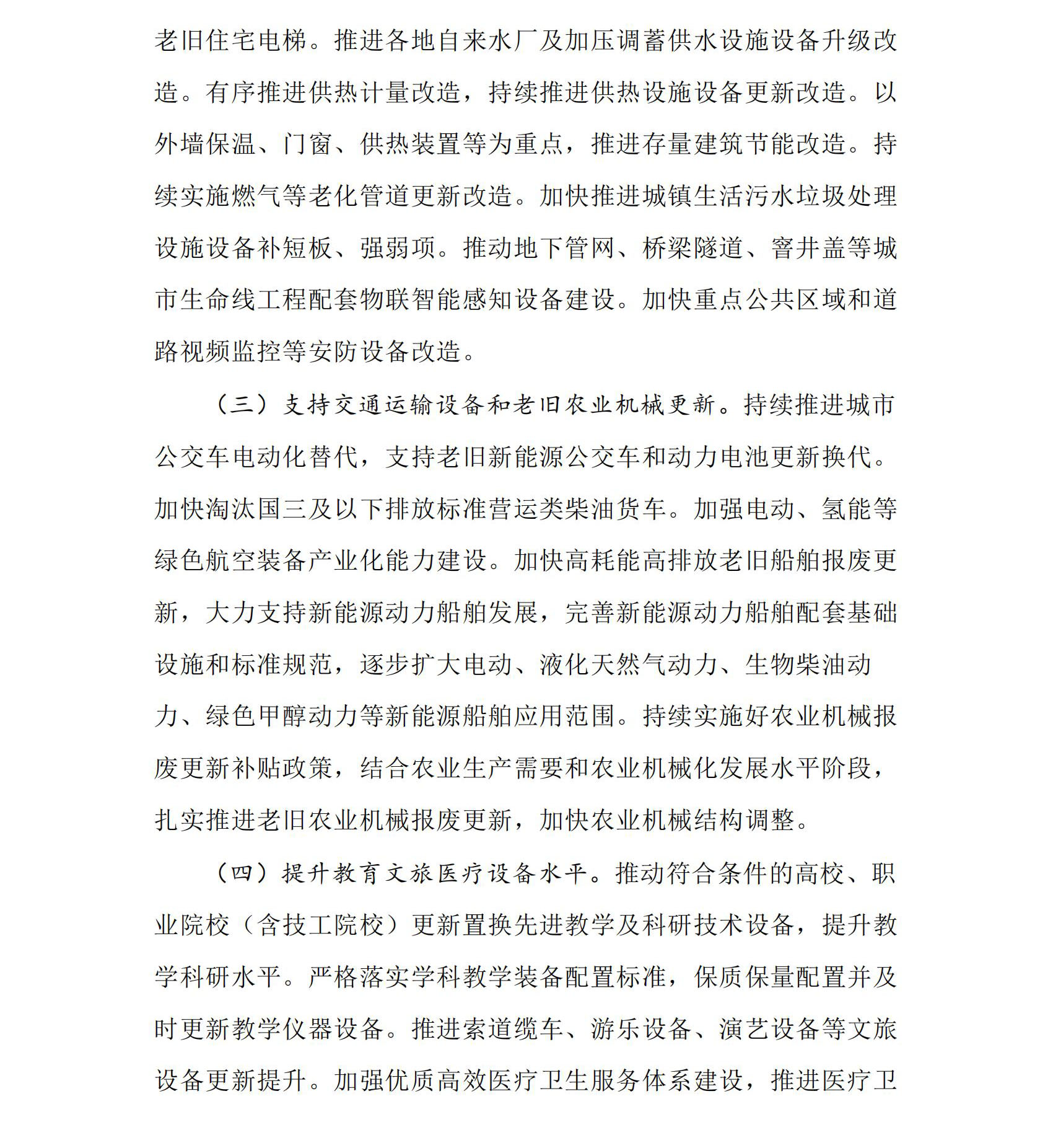(二)加快建筑和市政基礎(chǔ)設(shè)施領(lǐng)域設(shè)備更新。圍繞建設(shè)新型城鎮(zhèn)化,結(jié)合推進(jìn)城市更新、老舊小區(qū)改造,以住宅電梯、供水、供熱、供氣、污水處理、環(huán)衛(wèi)、城市生命線工程、安防等為重點(diǎn),分類推進(jìn)更新改造。加快更新不符合現(xiàn)行產(chǎn)品標(biāo)準(zhǔn)、安全風(fēng)險高的老舊住宅電梯。推進(jìn)各地自來水廠及加壓調(diào)蓄供水設(shè)施設(shè)備升級改造。有序推進(jìn)供熱計(jì)量改造,持續(xù)推進(jìn)供熱設(shè)施設(shè)備更新改造。以外墻保溫、門窗、供熱裝置等為重點(diǎn),推進(jìn)存量建筑節(jié)能改造。持續(xù)實(shí)施燃?xì)獾壤匣艿栏赂脑臁<涌焱七M(jìn)城鎮(zhèn)生活污水垃圾處理設(shè)施設(shè)備補(bǔ)短板、強(qiáng)弱項(xiàng)。推動地下管網(wǎng)、橋梁隧道、窨井蓋等城市生命線工程配套物聯(lián)智能感知設(shè)備建設(shè)。加快重點(diǎn)公共區(qū)域和道路視頻監(jiān)控等安防設(shè)備改造。