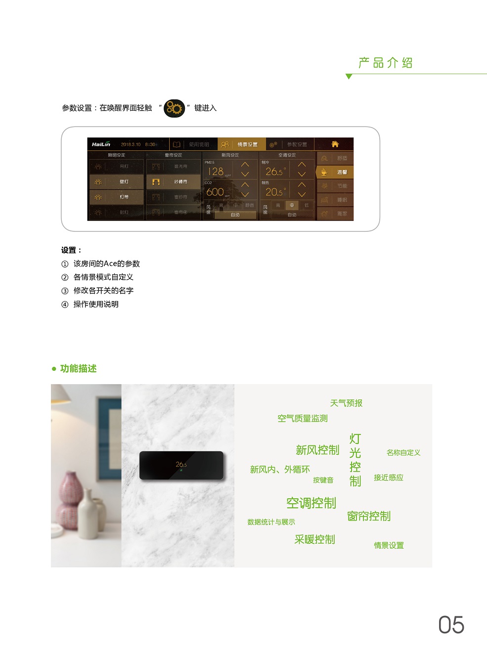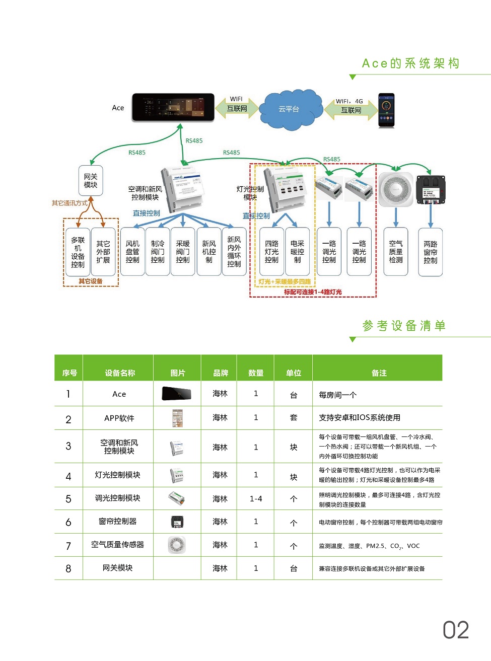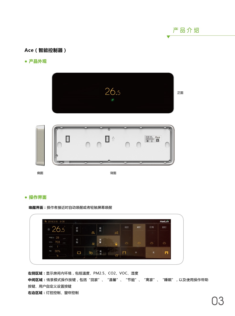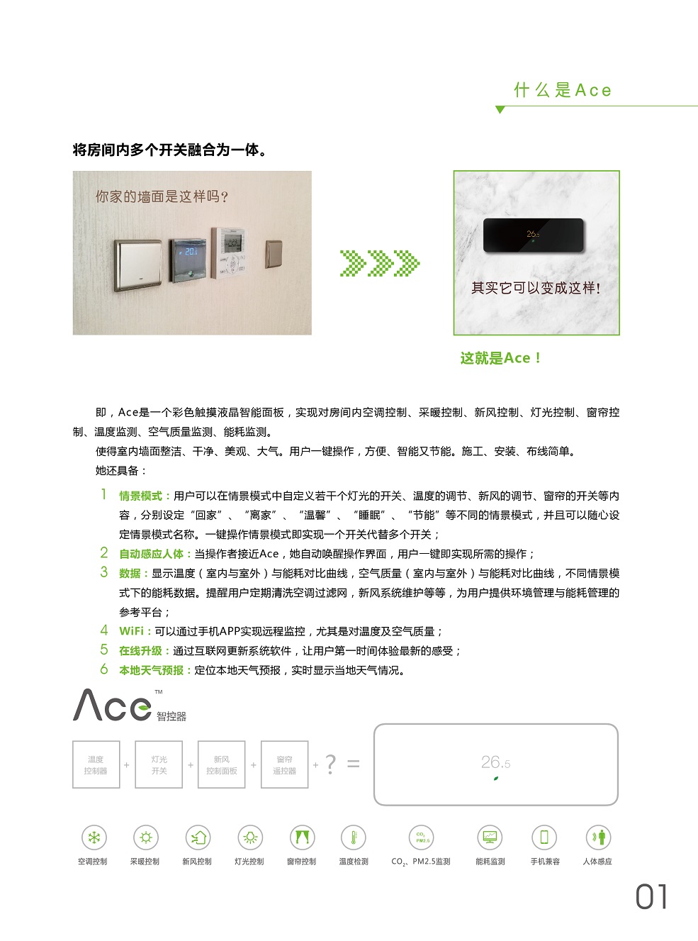 ACE將溫度控制、燈光控制、窗簾控制、新風控制、空氣檢測集于一身,采用控制模塊集中控制,控制面板弱電連接方式,極大程度減少布線及人工成本。ACE+自學習,不斷優化用戶使用習慣,減少生活浪費,ACE就是您身邊的隱形管家。