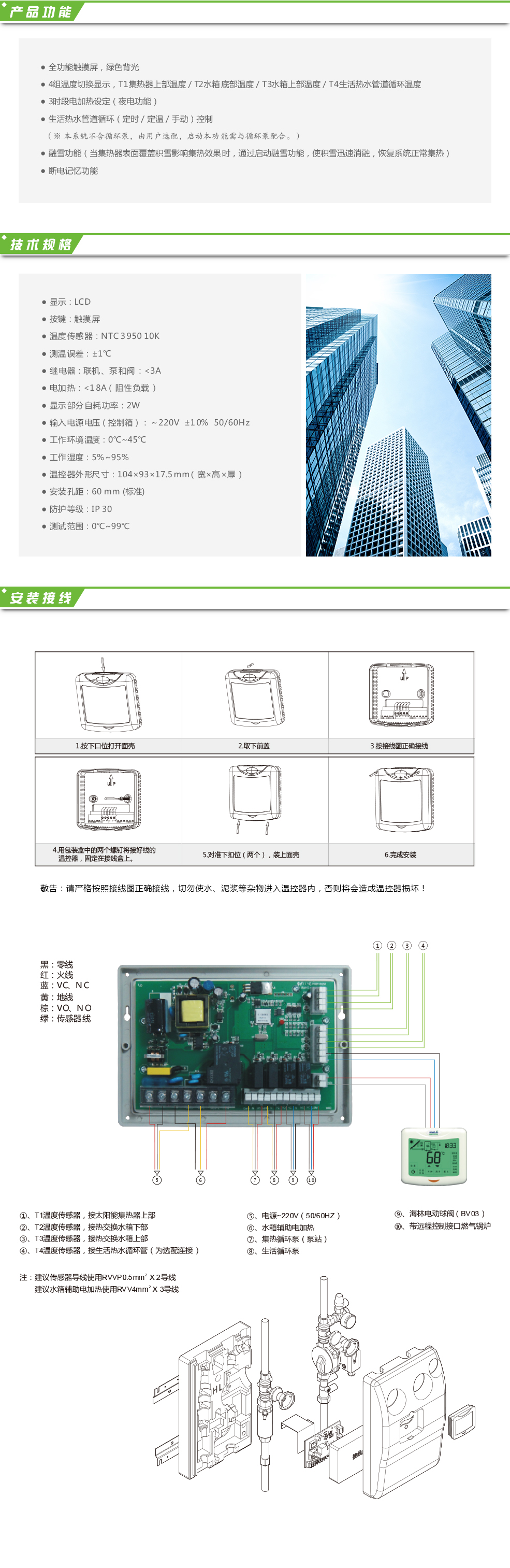 HS2018分體式太陽(yáng)能熱水器控制器應(yīng)用于太陽(yáng)能熱水系統(tǒng)的智能化監(jiān)控與管理。采用綠色背光,液晶觸摸屏,控制主板與控制面板分離式設(shè)計(jì),并通過(guò)溫差和實(shí)時(shí)通訊,來(lái)控制太陽(yáng)能集熱器端與水箱端熱交換循環(huán)泵、用戶端生活熱水循環(huán)泵和定時(shí)啟動(dòng)輔助電加熱等設(shè)備,以實(shí)現(xiàn)系統(tǒng)自動(dòng)運(yùn)行,方便用戶使用的目的。