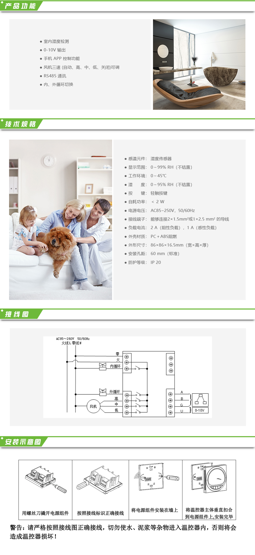 豪華型大液晶顯示新風控制器,可通過無線 APP 遠程操控,適用于工業、商業及 家庭居室的新風控制,可選擇風機為室內、室外循環模式,風機三速(自動、高、中、 低、關閉)可調,帶 RS485 通訊轉換控制。 新風控制器采用微電腦控制技術,大屏幕液晶顯示,可從云端獲取室內環境信息 并可通過液晶顯示:PM2.5 濃度顯示(ug/m3)、濕度顯示(%RH)、CO2濃度顯示(PPM)、 時鐘顯示 ...