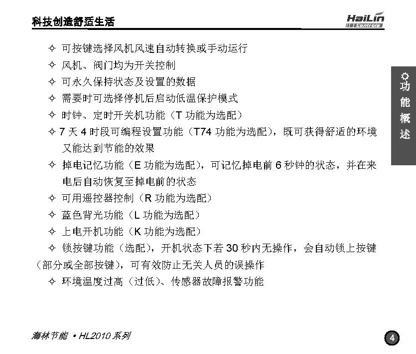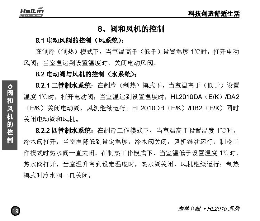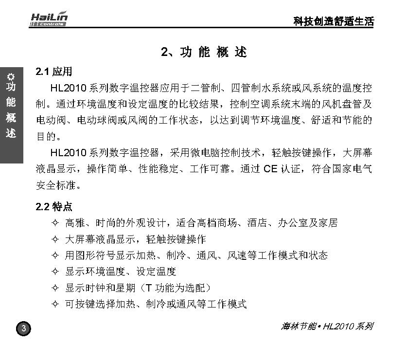 HL2010系列數字溫控器應用于二管制、四管制水系統或風系統的溫度控制。通過環境溫度和設定溫度的比較結果,控制空調系統末端和風機盤管及電動閥、電動球閥或風閥的工作狀態,以達到調節環境溫度、舒適和節能的目的。